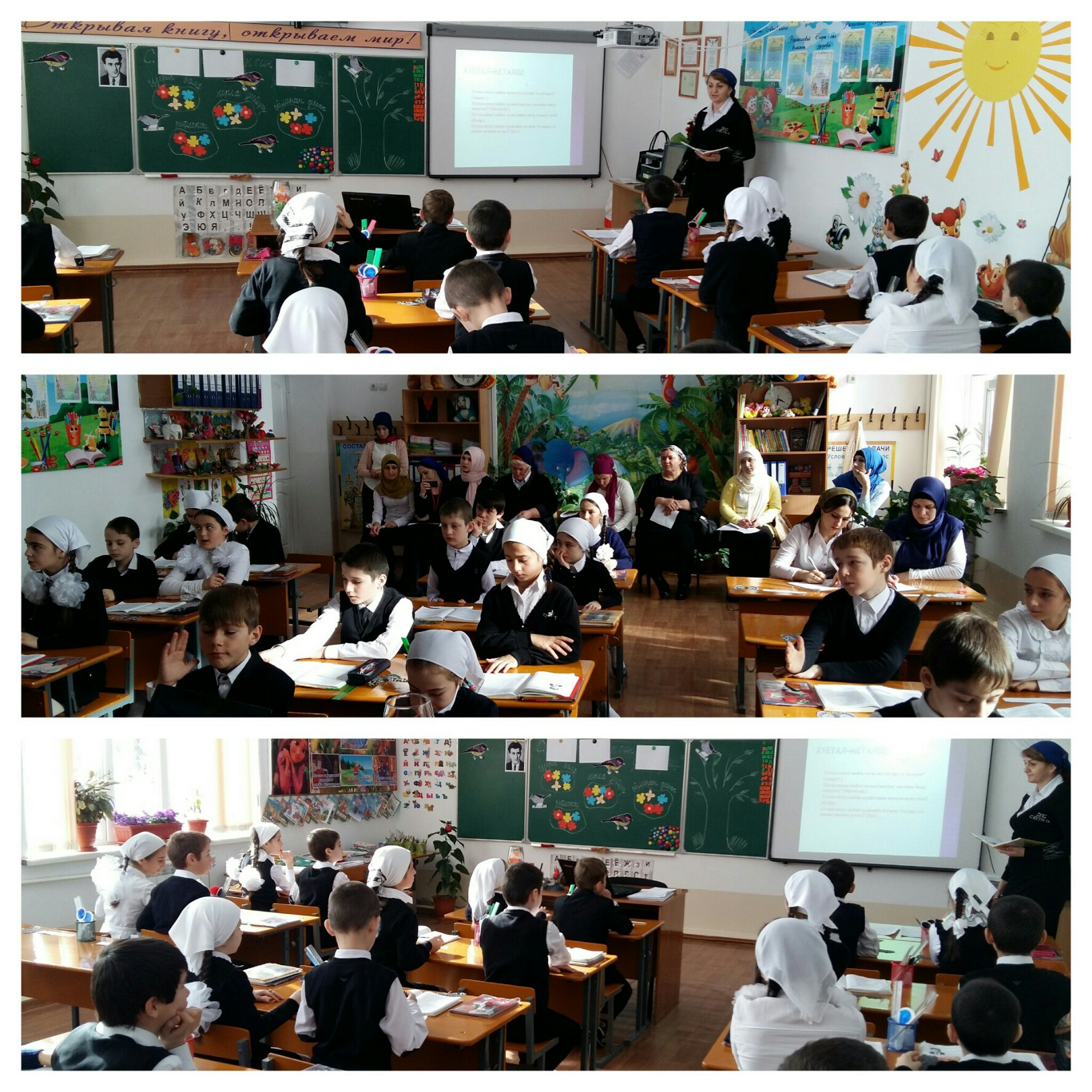Учительница начальных классов Батукаеа Х.А. провела открытый урок в 4 «Б» классе на тему С. Бадуев «Со хьуна кхи декар дац» (Чеченская литература)