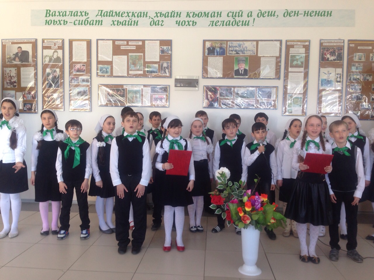 Учитель начальных классов Шахгириева З.Е и учащиеся 4 а класса подготовили и провели 23.04.15 общешкольное мероприятие «Люблю тебя, мой край родной!» Своими стихами и песнями они выражали свою любовь к родному Кавказу.