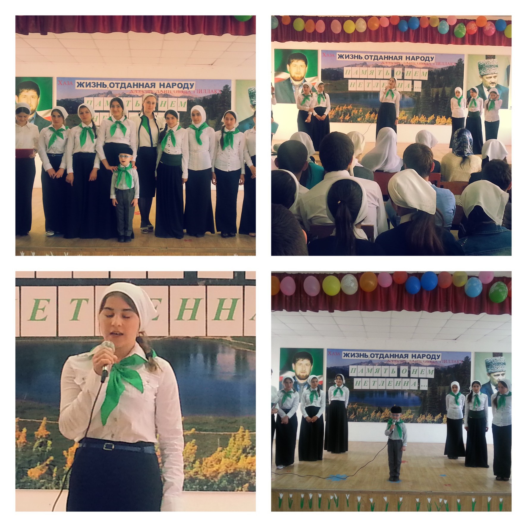 На сцене прозвучали стихи («Родимая Чечня», «Вицлур вац», «Дика к1ант», «Сан дозалла»); песни, посвященные Родине и Памяти Первого Президента Чеченской республики. Далее был просмотр ролика о жизни и деятельности А-Х Кадырова и процитированы слова одного мыслителя: «Человек умирает не тогда, когда останавливается сердце, а тогда, когда о нем исчезает память».Память Ахмат-Хаджи Кадырова не угаснет, она увековечена многими фактами. В заключении мероприятия выступила кл. руководитель Абдурзакова М.М. со словами: «Для всех нас Ахмат-Хаджи Кадыров навсегда останется символом единения нашего народа. Перед светлой памятью этого человека мы обязаны сделать все возможное, чтобы его надежды, идеи были притворены в жизнь».